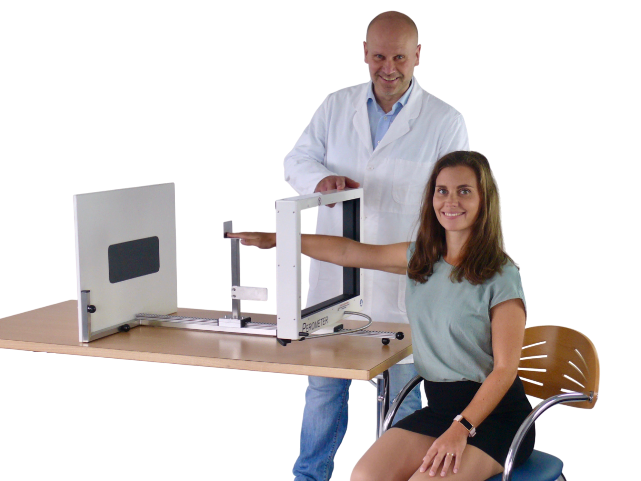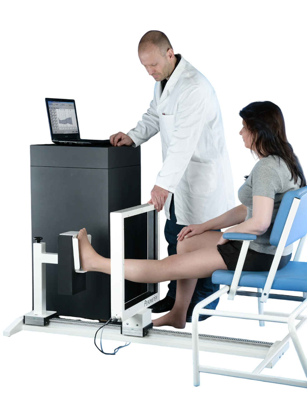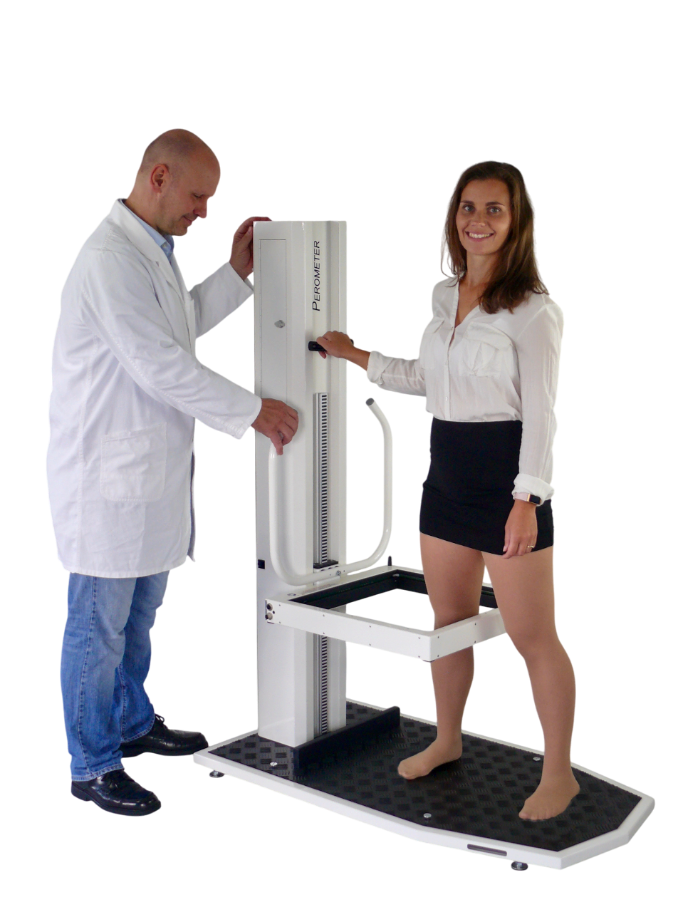 Der Perometer-Typ 400 MT zeichnet sich durch einen senkrecht verfahrbaren Messrahmen mit einer Lichtweite von 47 cm x 47 cm aus. Die Beine des Patienten oder der Patientin werden im Stehen vermessen. Beim Vermessen von Ödemen der Arme sitzt der Patient seitlich auf einem Stuhl und hält den Arm an einem Adaptergriff in die Rahmenöffnung hinein. Zur Messung wird der Messrahmen innerhalb von etwa 3 Sekunden einmal hoch und einmal herunter über die Extremität verfahren. Details zum Gerät →